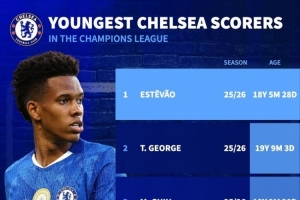 体育资讯10月23日讯 德国转会市场列出了切尔西队史欧冠最年轻进球者排名,埃斯特旺居首。