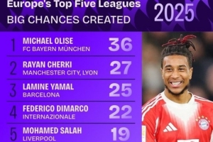 上一篇: 2025年五大联赛创造机会榜:B费居首,萨拉赫、姆巴佩等在列